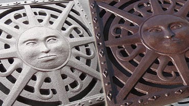 Shown is an Interaken grate when received raw (natural) from the foundry, after exposure to moisture and after the Baked on Oil Finish is completed.