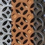 Please note that the majority of the grates shown are as they appear when first cast at a foundry. All raw cast-iron grates begin to naturally rust with exposure to any form of moisture and will appear bright orange before settling to brown. Condensation and humid climates can also accelerate the process. In many cases, cast iron turns bright orange within hours of exposure and can take several years to settle to the familiar brown patina seen on most parking lot grates. Baked on Oil Finish (BoOF)has become a popular option for grates. Although it does not prevent rusting, a baked-on oil finish expedites the natural oxidation so that the patina is more settled at the time of purchase.