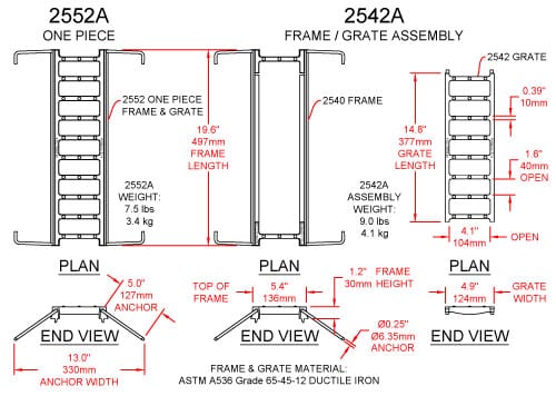 Interceptor one-piece frames maintain the maximum open area while still being bicycle safe. Each 1/2 meter unit features four anchoring brackets, which reinforce the system to exceed AASHTO H-25 and HS25 loads. Two-piece cleanout frames ensure maintenance access.