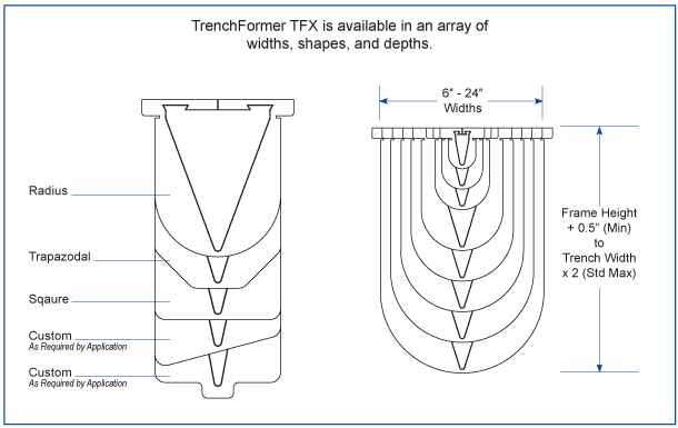 TrenchFormer® frames come standard in black painted steel or hot dip galvanized. Stainless steel, fiberglass and aluminum frames are also available.