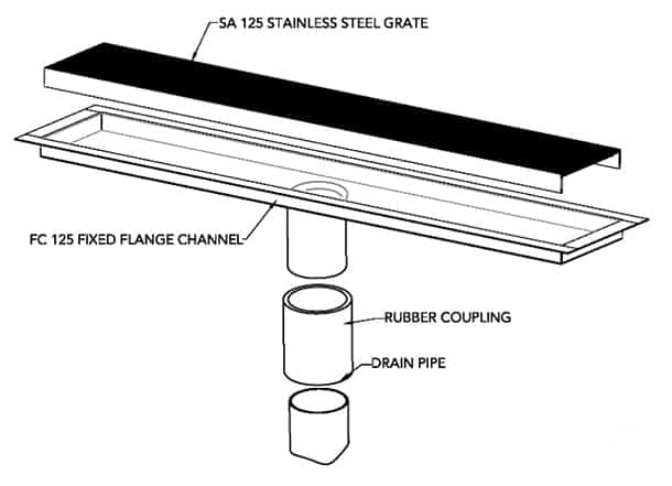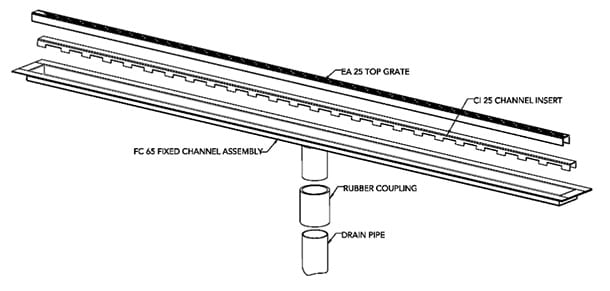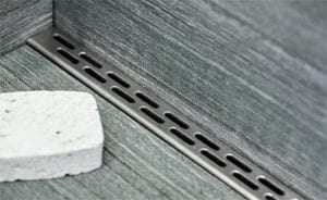 The 1” wide FF Series by Infinity Drain features a pre-sloped stainless channel with set bottom outlet that connects to 2-1/4″ piping.