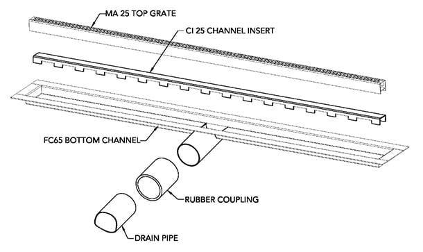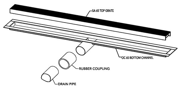 The 1″ FT Series stainless drain features a pre-sloped channel with a set side outlet for easy installation.