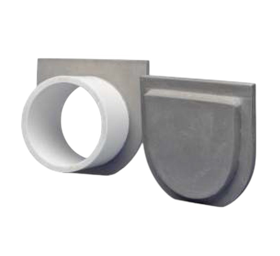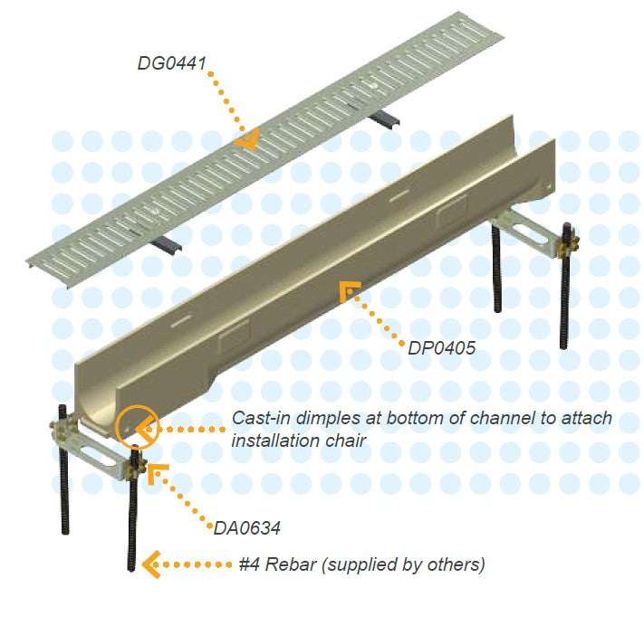 Installing the POLYCAST® 400 Series is made easier with installation chairs, which screw snugly into dimples located at the ends of each channel. Staked to the ground with rebar, POLYCAST® installation chairs allow contractors and homeowners to secure and adjust channels on-site for an easier installation. Solid end caps and 3” diameter pipe outlets come standard with the 400 Series. You can also drill out the channel bottom “knock-out” to attach a pipe as a bottom outlet.