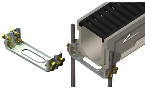 Installation chairs are the most efficient and economical means of setting up a precast trench system. The installation chair supports the ends of the channel, aligns and locks the joints rigidly together, and prevents the channels from floating. Adjusting channel elevation is easy. One chair is required for every joint. Each chair is made from 1018 hot-rolled steel and has a zinc-plated finish.