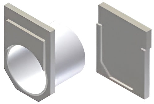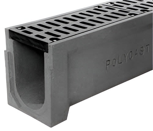 Polymer concrete end caps are used to enclose or provide piping transitions as channel outlets. End caps output to a 6″ or 8″ pipe. The material is polymer concrete.