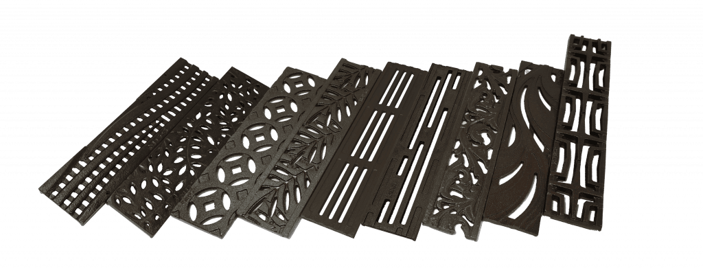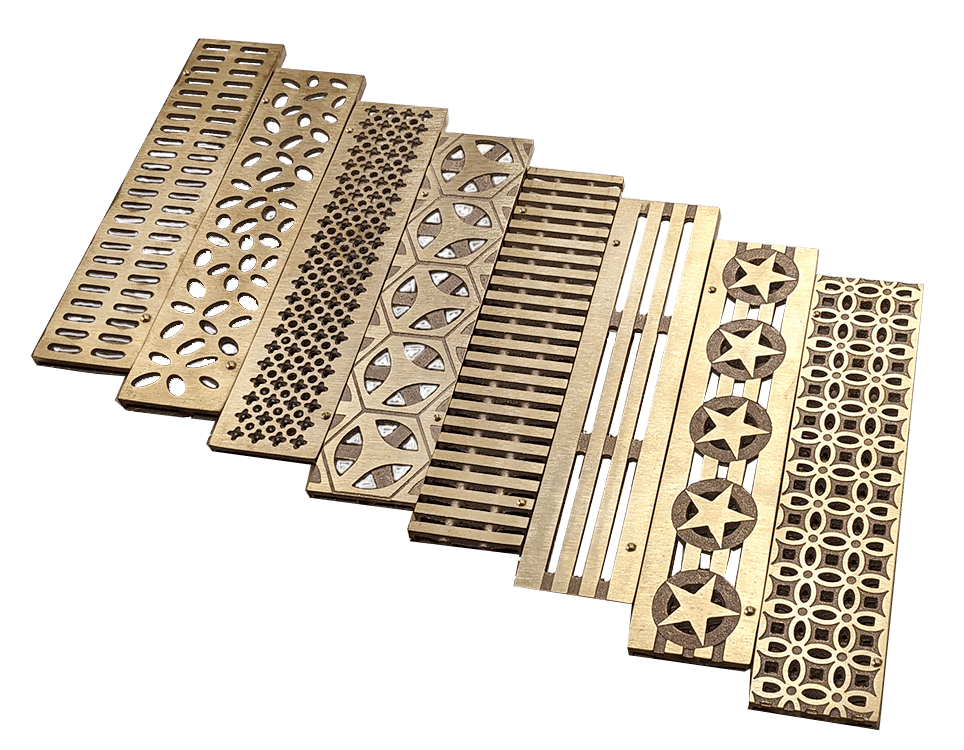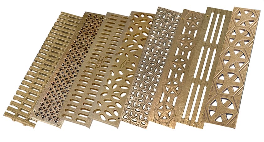 Slotted, rain drop, cathedral, tardis, pedreda, bars, stars, and luna polished bronze grate patterns.