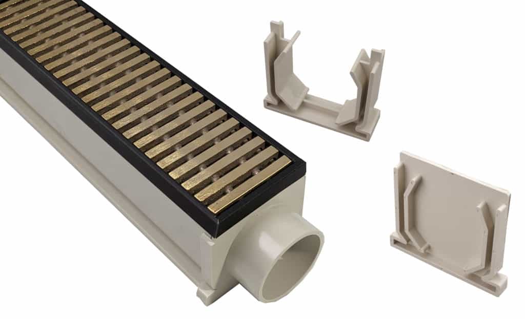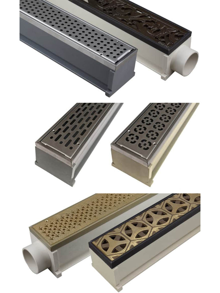 Choose your favorite grate among the numerous material options of Stainless Steel, Brushed Bronze, Natural Bronze or Cast Iron to complement the channel edging.