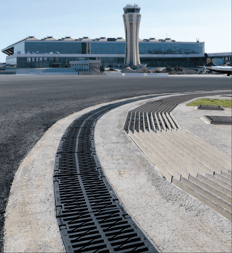 ULMA’s F250K linear drainage system is made with polymer concrete and integrated galvanized steel edges for lateral protection. This drainage solution is intended for heavy equipment and continuous traffic areas with load class ratings C through F including unloading docks, ports, warehouses public roads and airports.