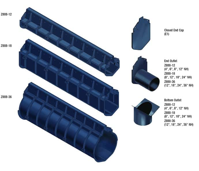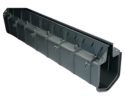 Each 2-meter (80”) channel connects together via a mechanical overlap, making installation quick and simple. Rebar clips along the channel walls hold the system in place during a concrete pour. An integral “Zip Strip” keeps the 1.75” wide throat shut, preventing debris and concrete slurry from entering the drainage system during installation.