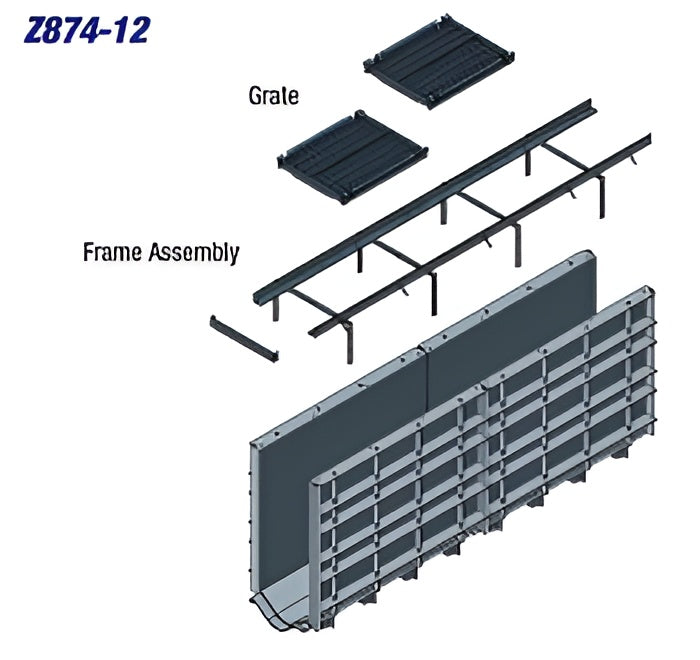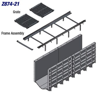 The 21″ Z874-21 System features a heavy-duty frame assembly and durable grates. With grating from Class A-F available, H-20 and FAA load requirements pose no problem for Z874-21.