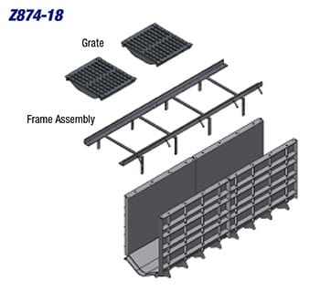 The 18″ (ID) Z874-18 Series evacuates almost twice the liquid as its 12″ wide companion. Each 2 meter channel is offered in neutral or pre-sloped option based on project need. The heavy-duty frame assembly reinforces the Z874-18 system against heavier traffic loads.
