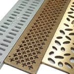 Decorative grating takes another step forward with Trench Drain Systems bronze and aluminum drainage grates. Designed for the NDS Mini Channel system, the grates are available in 5 different patterns including Slotted, Rain Drop, Cathedral, Tardis and Pedreda. Bronze is offered in natural and polished. Aluminum is available in natural or can be custom powder coated to the color of your choice.