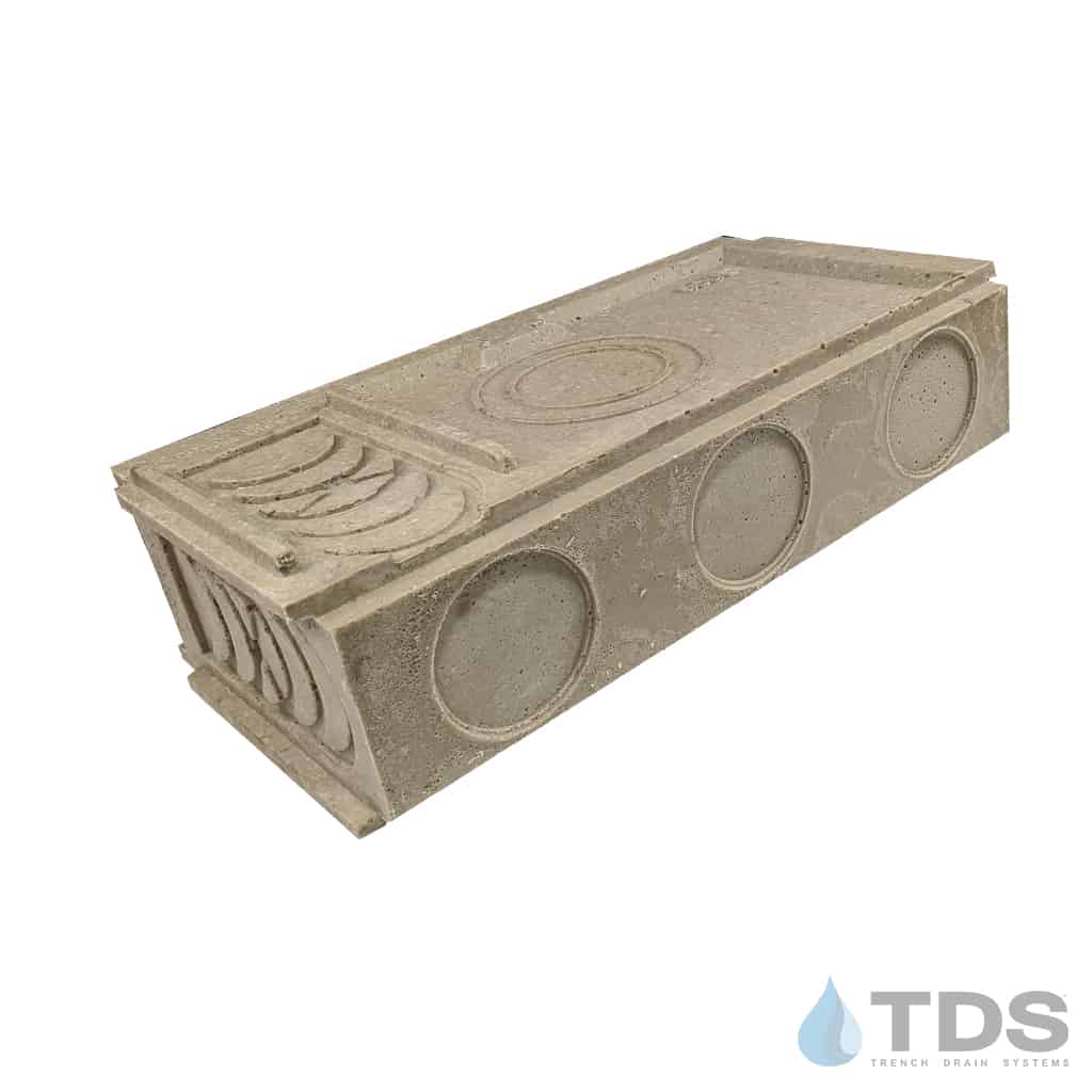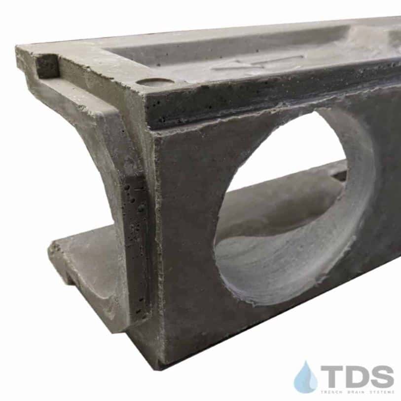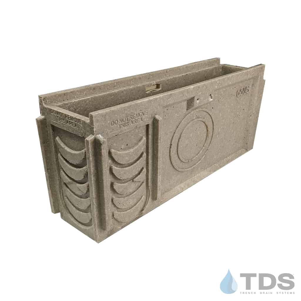 Many polymer concrete drainage systems have impressions molded into the channels that allow for side, bottom or end outlets to be knocked out. These openings provide an area that accommodates pipes and pipe fittings such as adapters.