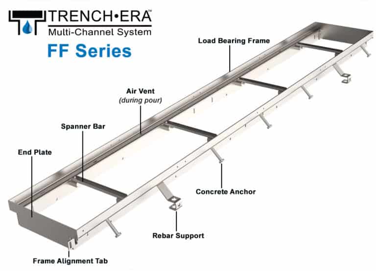 Trench Era represents several series of high-capacity trench drain systems designed to provide versatility to project designers as well as contractors. They consist of three main groups including frame and rail, EPS foam forms (coming soon) and prefabricated channels.